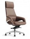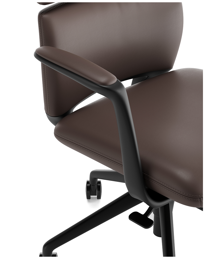 This executive chair combines premium dark brown genuine leather with a contoured seat and ergonomic design for all-day comfort. It features a black powder-coated five-star base with PU casters for smooth mobility. Black painted aluminum armrests topped with leather add style and comfort, while ergonomic controls beneath the seat provide height adjustment and a 3-position tilt-locking mechanism for personalized support.