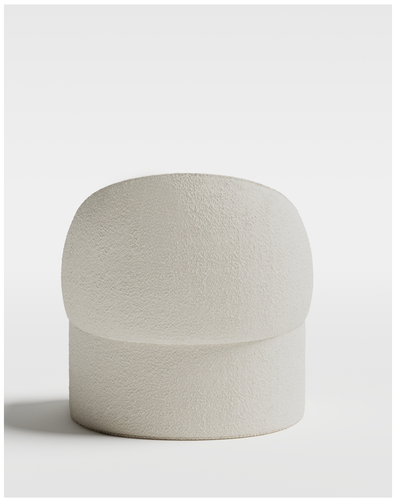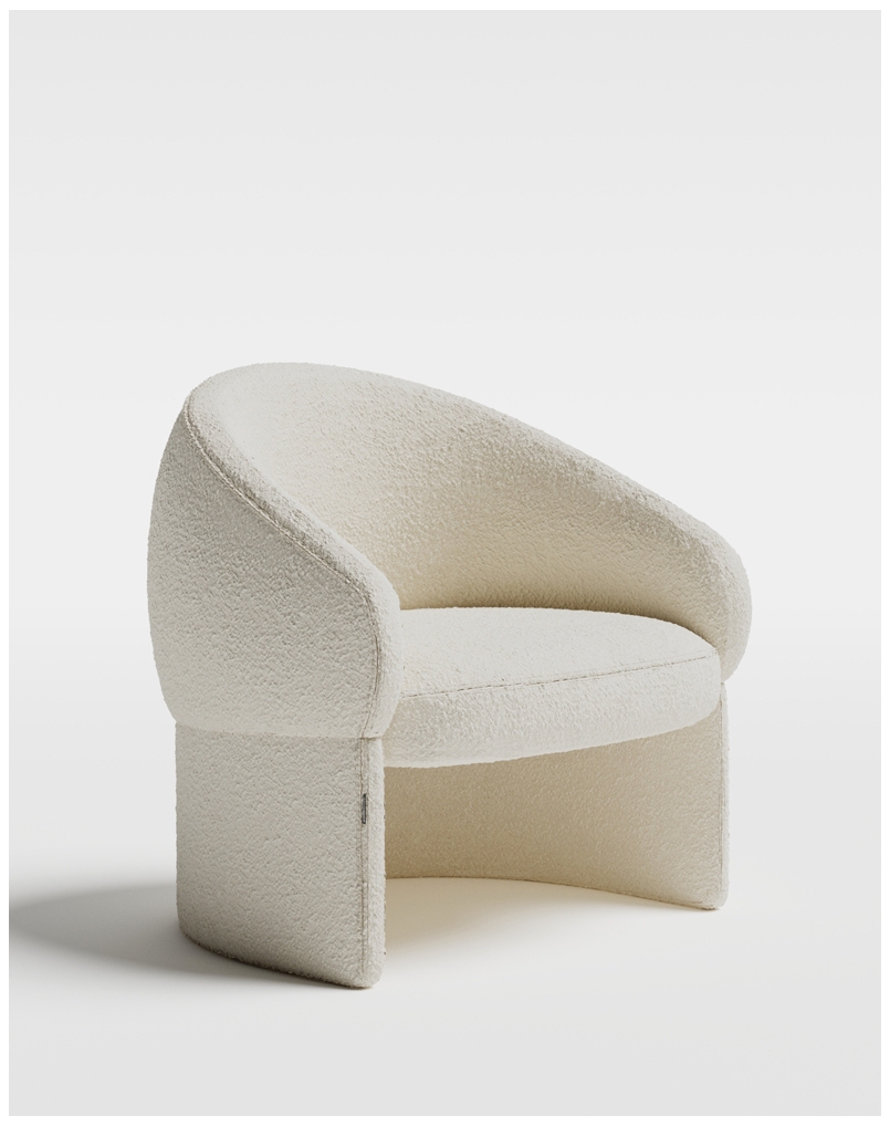 A modern lounge chair with a softly curved silhouette, fully upholstered in textured boucle fabric. Its sculptural form, integrated backrest, and generous seat create a cozy yet refined look, offering both comfort and style. Ideal for contemporary spaces, lounges, or reception areas.