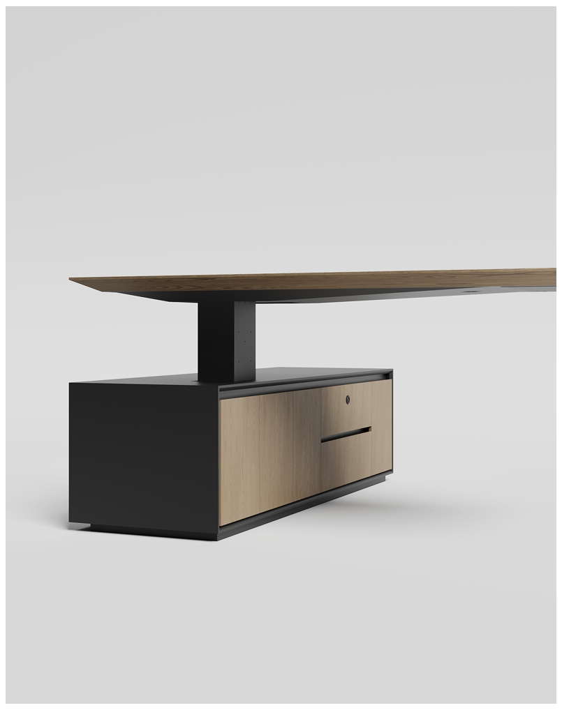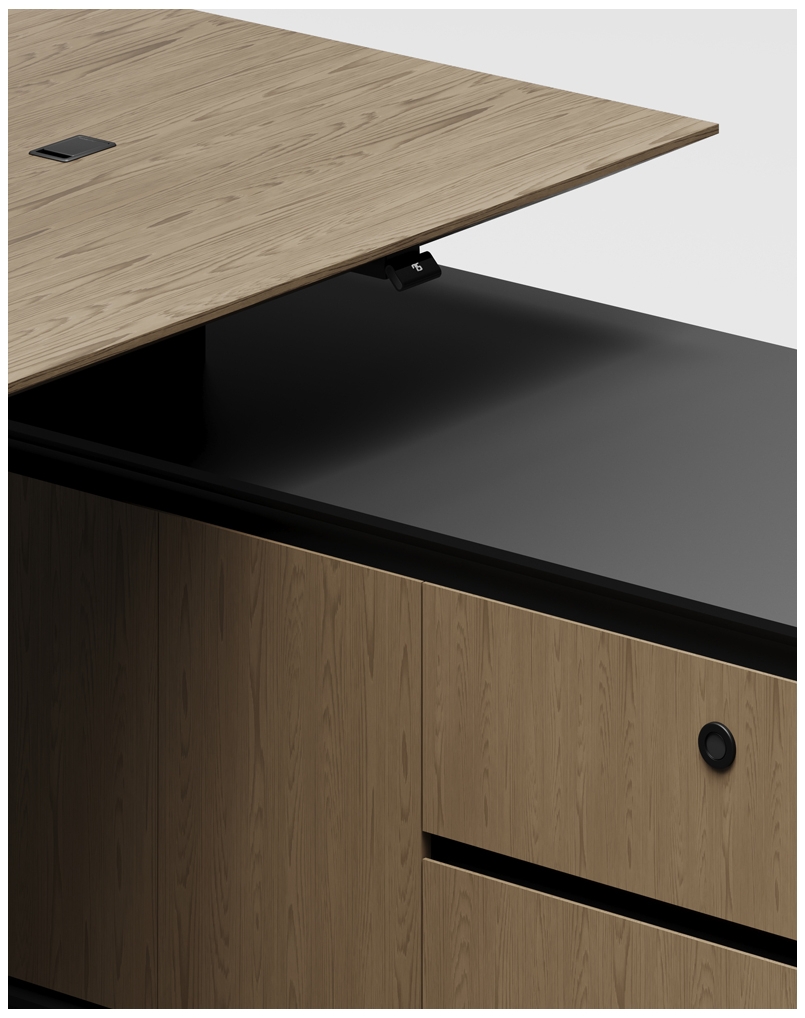 Dit directiebureau, dat in een beperkte oplage wordt geproduceerd, herdefinieert moderne werkplekken met zijn opvallende, vrijdragende vorm en zwevende bovenkant van houtfineer. Het elektrische hoogteverstelsysteem maakt soepele overgangen van zitten naar staan mogelijk, terwijl biometrische vingerafdrukbeveiliging, dubbele draadloze opladers en geïntegreerde voedingsmodules zorgen voor naadloze, overzichtelijke prestaties.