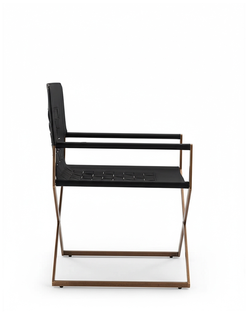 De Martin Director Chair met een X-vormig frame in een elegante bronzen afwerking. De zitting en rugleuning zijn gemaakt van hoogwaardig echt leer met een prachtig geweven designdetail. Een stijlvolle keuze voor directiekantoren of luxe woonruimtes.